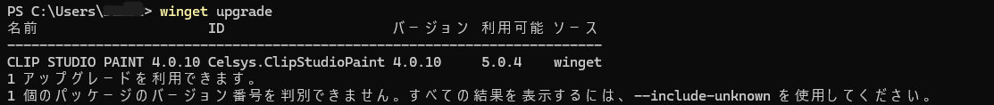 Clip Studio をインストールしている PC で winget upgrade をすると、Clip Studio のバージョンアップが表示されるようになっていました。